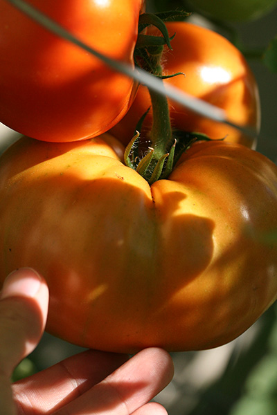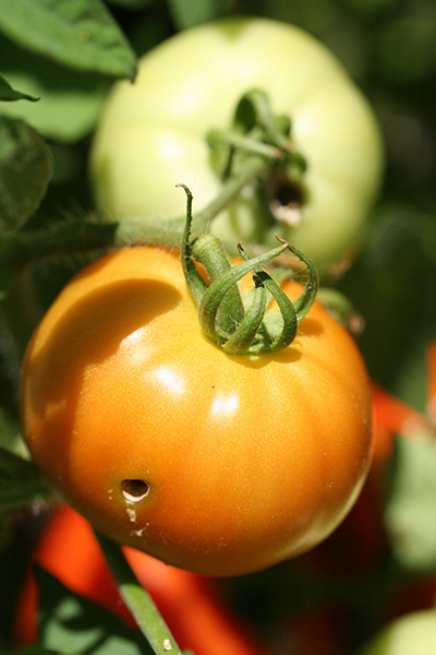 each summer a few tomatoes succumb to fruitworm damage. badly damaged tomatoes i pick off and throw away, but a few with holes in them seem solid enough to make me believe that they might've escaped further worm damage. i guess i'll find out once they fully ripen.