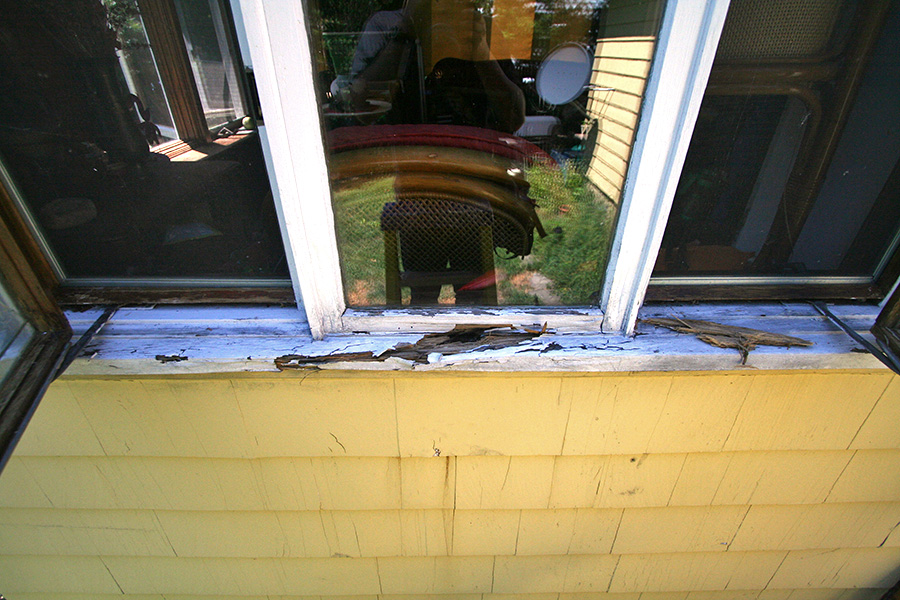i checked out the rotting windowsill on the eastern side of the sun room, which i first pointed out to my father last weekend. it's sort of a dry crumble, weather damage as opposed to insect damage. it definitely needs to be repaired before winter though. my father's already been talking with some window people to get it replaced and fixed. all three andersen windows have to be taken down since they came as a set.