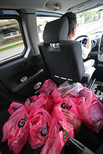 it took me maybe 5-7 minutes, but by the time i got back, the longans were almost all sold out! i grabbed what was left, and ended up taking away almost 9 lbs worth. standing in line waiting to pay, i noticed almost every customer had a bag of longans in their shopping cart. back outside i was faced with a new challenge. originally i figured i could put all the longans into my camera bag, but i didn't expect to buy so much. even if i took everything out, it still wouldn't fit inside the bag. fortunately i had the foresight to bring along my bungee netting. fitted with 6 rubberized hooks, i strapped the bag of longans to the back of the bike. i was worried it might fall off and kept on looking back, but that was probably the most secure thing on the bike.