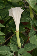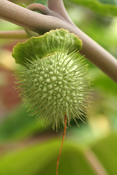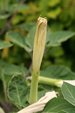 outside was a miniature evergreen garden and a herb bed. by one of the entrances sat a potted plant that looked like angel's trumpets (Brugmansia) but without the fragrant smell and the drooping flowers. turns out it was a datura plant, related to potatoes (obvious from the way it was growing).