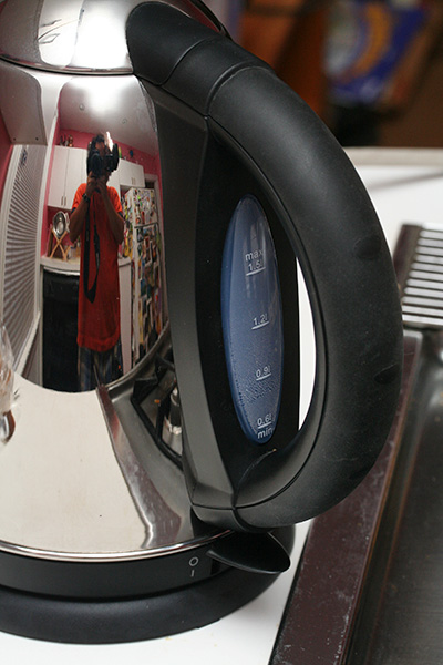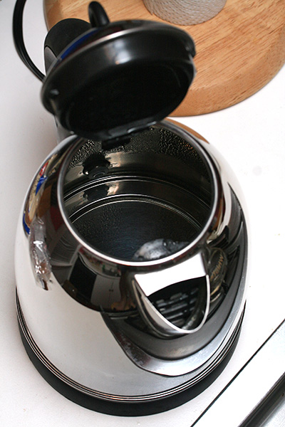 back at home, i tried out the electric kettle for the very first time. it's official name is quite a mouthful: the aroma AWK-115S hot H20 x-press 1-1/2-liter cordless water kettle. it's got a whole slew of features: stainless steel construction, water level indicator; power indicator light; 360° base; and removable hard water deposit filter. it also had something the hamilton beach model didn't have: a completely empty interior chamber. the lid was also different. on the hamilton beach model, the refill lid could be opened with a button on the handle. on the aroma, you had to manually open the lid, making for a tighter (safer?) fit.