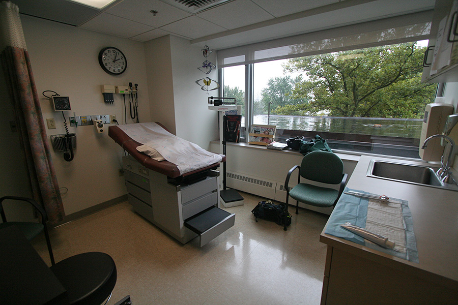 i was greeted by a different woman at the primary care reception desk, but she seemed to be adhering to the previous dress code of revealing tops. after i made my co-payment, i sat in the empty waiting room, the rain still dripping from my wet hair. i was called into an examination room minutes later.