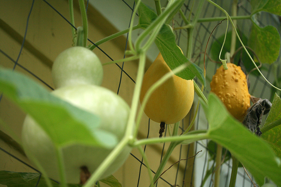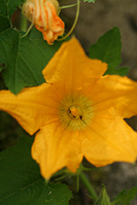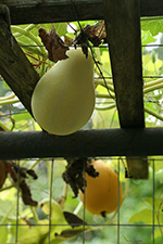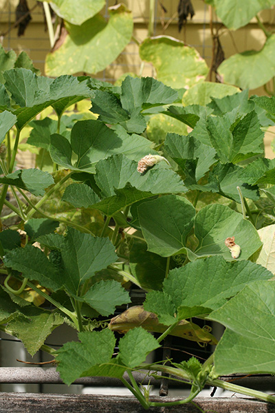 what's surprising is there seems to be a resurgence in new squash growth. my own theory is now that the squash vine borers have all pupated, and the weather is too cool for the spread of powdery mildew, the squashes (AKA fancy gourds) have taken the opportunity to stage a comeback. besides a flourish of healthy leaves, there are also new flowers. unfortunately none will into gourds before the growing season is officially over.