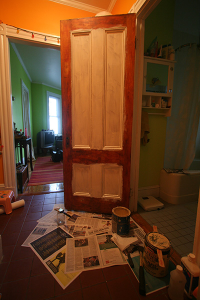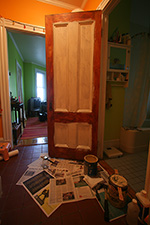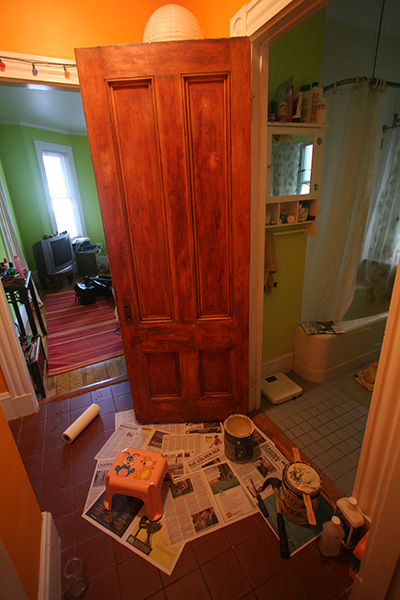 back at home, i was surprised by the paint smell despite my bathroom ventilation setup. even more surprising was that the door wasn't dry yet after 7 hours. it may take 24 hours or more for the paint to completely dry, one of the disadvantages of oil (compared to latex). with my new roommate moving in wednesday morning, i was running out of time. i set the fan blowing directly onto the door to speed up the drying. when i checked again hours later, it seemed to be better, but still sticky in some areas. most of the flat surfaces are dry, while the moulding still feels tacky. i wonder if it means i didn't remove all the citristrip and some residue is preventing dryness? i'll check it again tomorrow. whatever the case may be, the paint show must still go home. final coat mañana.