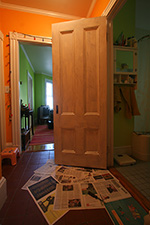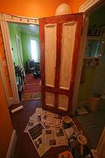 this morning i sanded down all the newly patched spots then gave the door one final wash with my last piece of steel wool. i changed out the newspaper and got ready to paint. the painting is actually the easy part of a paint project; it's the prep work that's more difficult and takes a long time. i've done so much painting in my lifetime that it feels like visiting an old friend: smelling the aroma of a just-opened paint can, stirring the content, presoaking the brush in thinner, applying that first paint stroke. it took me less than an hour to prime the door (this is the initial prime coat; the final coat is tomorrow). i came across this helpful website that diagrammed the proper sequence of door painting.