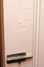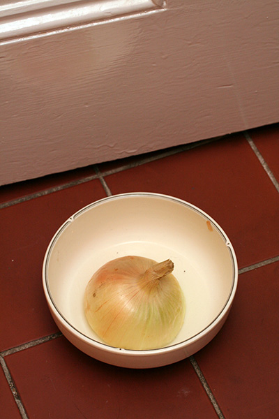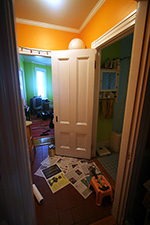 once the door was finished, there was the matter of drying, and the additional problem of smell control. oil paint has a strong odor, there's no way to mask it. once again i closed the door and set up a fan to blow dry it from inside the bathroom. i opened up as many windows as possible, but seemed to help with getting rid of the smell from the house, but the door itself had an odor due to the paint which couldn't be removed. i tried the onion trick, cutting up half an onion and putting it in a shallow bowl of water. that might've worked (or a waste of a perfectly good onion), but like i said, it was the door itself had smelled, and that odor will only go away over time, like weeks. i just hope my roommate doesn't mind. it's one of those odors that isn't really localized, and can be smelled from anywhere within the house, but just as quickly disappear.