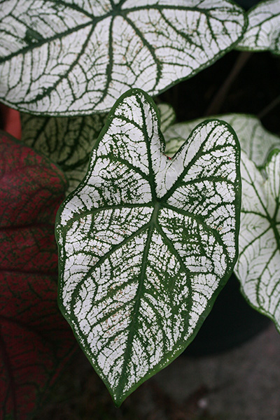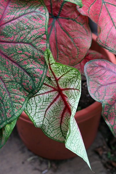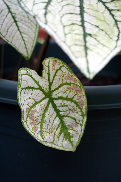 the caladiums are doing well, despite night time temperatures below 60 degrees, their minimum tolerance. a few leaves are showing temperature damage though. before it gets too cold, i'll have to dig them up and get them ready for winter storage. one particular plant is showing some strange colors, both reds and whites.