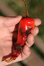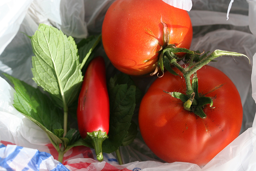 i paid another visit to the garden. i knew i still had some hot peppers left, but was surprised to find some ripe tomatoes as well. i ate some raspberries and left.