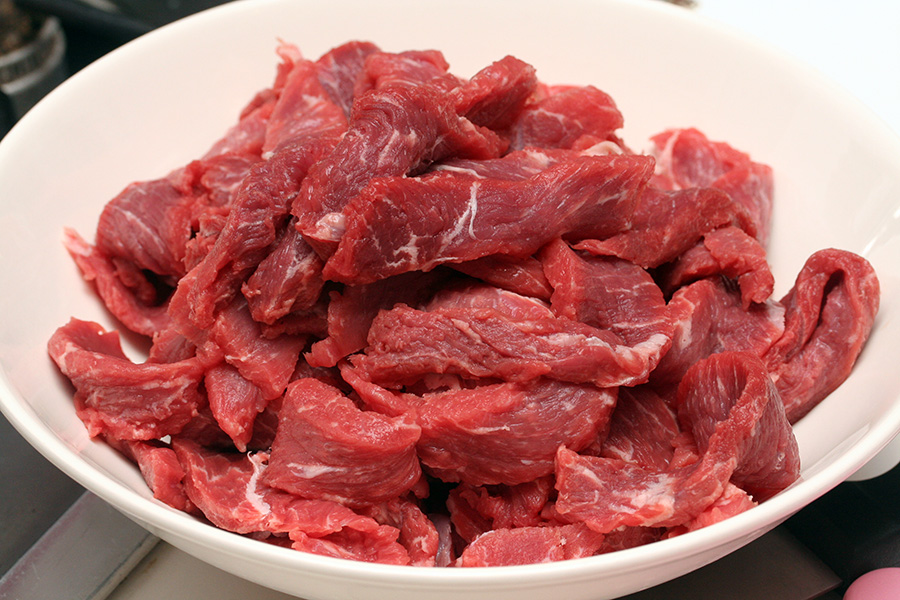 the steaks were finally solid enough for thin slicing by 2:00. they were still a little soft in the middle, but i couldn't wait any longer. recipe said to cut them 1/8" but i basically eyestimated the thickness (who's got time for rulers?). i had two london broil steaks and a small satellite piece. i trimmed off as much fat as i could (remind me to toss the trash tomorrow, it's going to stink.
