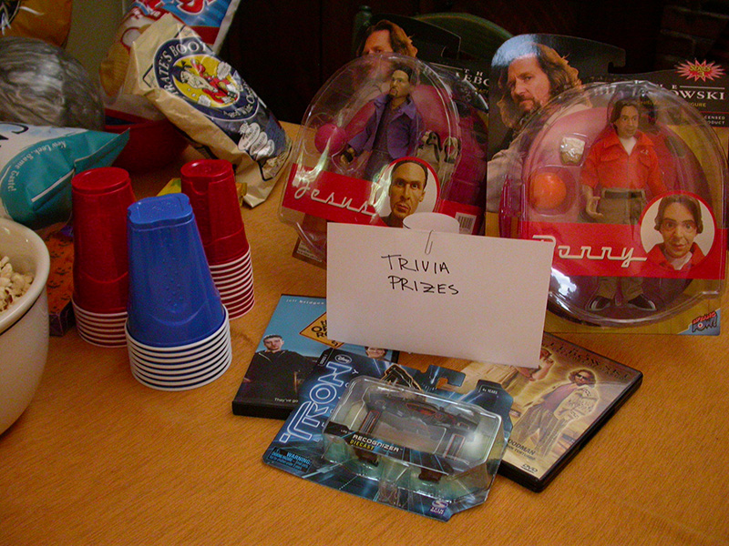 at this point elias tallied the scores for the trivia contest. amanda and fran tied for first place, while mike and i tied for second, with chloe coming in third (though actually fifth in the prize picking pecking order). fran went with the lebowski jesus action figure, while mike took home the donny figurine. amanda won the tron diecast flying space T while i grabbed the big lebowski dvd.