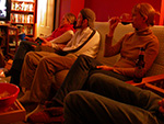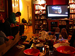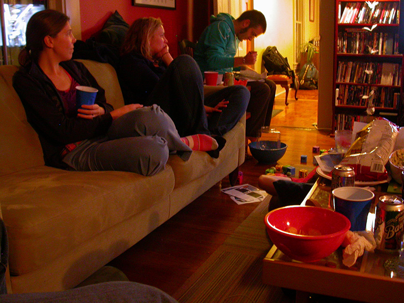 i went to the falafel place to get a lamb schwarma wrap (switching it up this time; traditionally i go for a no.6 spicy chicken sandwich at the nearby wendy's) and thought i'd be late but i was the first guest to arrive. mike showed up next, followed by elias' sister chloe (all the way from vermont) and her friend mariana. elias told us jeff bridges was actually in town (for some kind of musical event), and he sent bridges' assistant a schedule of our movie marathon; she actually responded and said she would forward the announcement to jeff, who would get a kick out of it (we were also hoping that bridges would do a bill murray and crash our marathon).