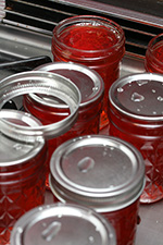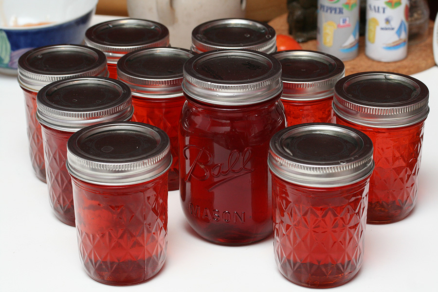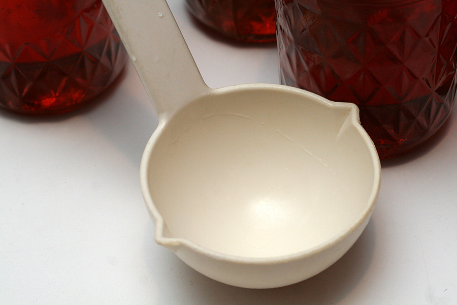 with the boiling stopped, it was time to pour the liquified jelly into the 8 oz. jars. learning from my mistake last time, i scooped out the foam jelly on the surface to enhance the purity of the jelly experience, free of unsightly foam bits. i found a ladle with 2 pouring spouts which greatly eased the transfer. i ended up with 9 jars of quince jelly (72 oz. total).