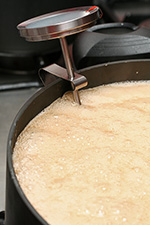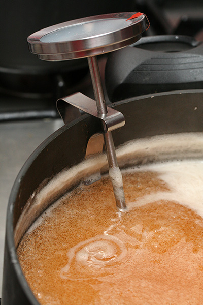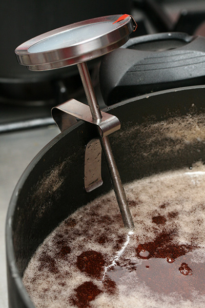 i started at 5:13 and officially turned off the heat by 6:10, so nearly an hour. the whole time i was stirring nonstop. instead of slowly adding the sugar like in the past 2 times, i dumped it all in in quick succession. that was a mistake, as the sugar congealed into a translucent blob that blocked the juice from properly boiling and big angry bubbles started to form. i stirred the pot more diligently, breaking apart as much sugar as i could. stirring is the key. stepping away for just a few seconds and the foam on the surface will solidify. the only way to prevent that without constant stirring is to turn up the heat for a more vigorous boil, but that in turn creates more foam, risking the danger of an overflow. the trick is to find that happy medium and to continue stirring, denying the foam a change to become weak surface jelly.