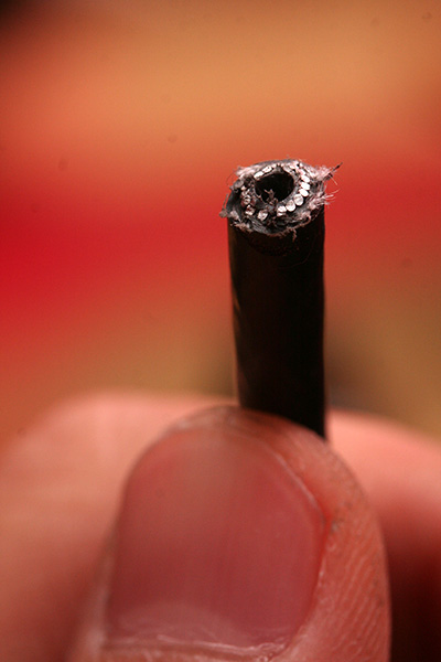 i first did a trial test, cutting off a small piece of cable housing.1 the smell of melted plastic and rubber mixed with flying sparks from the wires inside. confident with my dremel skills (or at the very least having proof that it was possible to cut through the cable) i began slicing the actual pieces of housing, using the old housing to figure out the proper lengths.