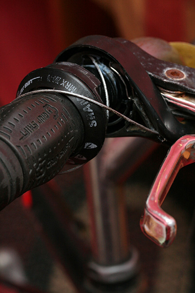 i stopped working close to 6:00. my mind has a tendency to shut down once it gets dark outside. i decided to work on one of my personal projects, installing new shifter cables on the work-in-progress bike parked in the kitchen.