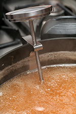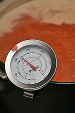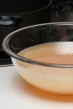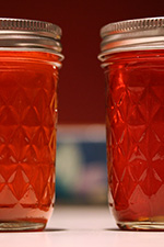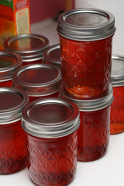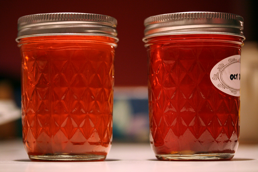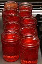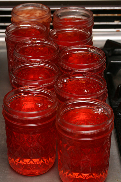 when the temperature finally reached 105°C (220°F) after about 35 minutes of boiling, i turned off the stove. cold plate test showed that the liquid solidifies but was still a little runny, which is the way i like my jelly. as it cooled, the thin layer of foam on the surface turned into jelly. i pushed it up against the side of the pot and skimmed as much as i could. i began filling the jars, sacrificing the first one by filling it with impure jelly bits, thereby guaranteeing the rest would contain only clear jelly.
