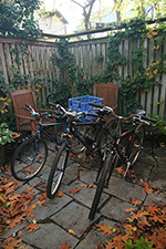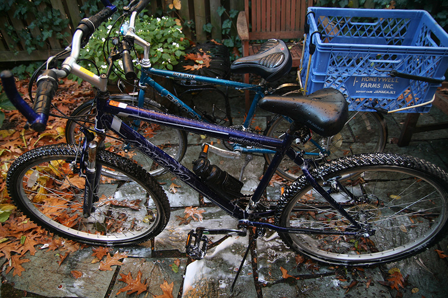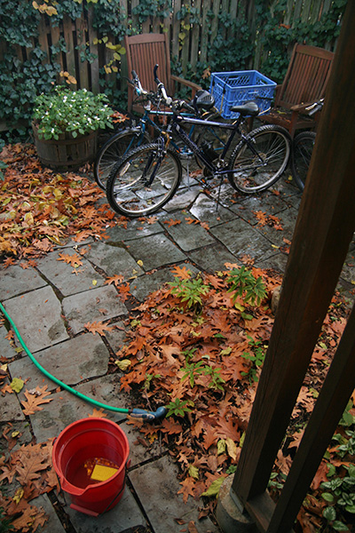 back at home, i first raked the backyard of the leaves before assembling all my bicycles for a washing. the one that needed it the most was the bianchi i normally ride, with mud caked on the frame and the wheel rims smeared black with grease. i ran out of the green bike wash spray, but some hot water and a scouring pad is pretty much all i need anyway. later i rinsed off the bikes with the hose then dried them with a towel.