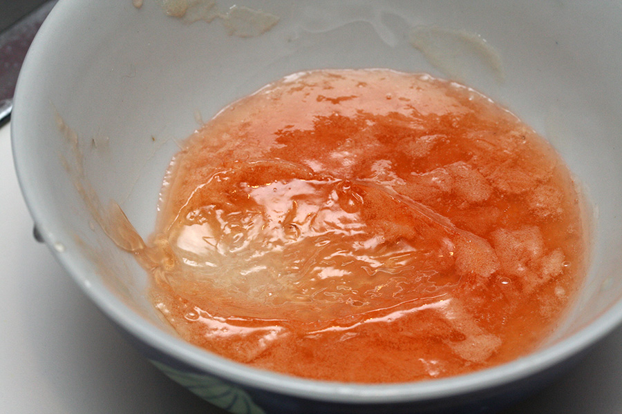 it was time to make my 4th and last batch of quince jelly, but first i had to sanitize the canning jars through the dishwasher, which takes about an hour. while the jars were going through the final half hour of air drying, i started boiling the quince juice. it didn't look like a lot this time but i ended up getting another 10 cups of fluid. to that i added 10 cups of sugar, slowly stirred in.