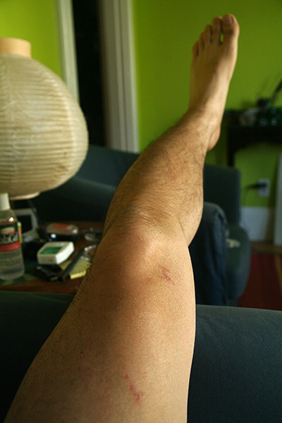 i seemed to have survived my scalding accident with very little injury. the one big blister (on my knee) had popped overnight, and there were a few reddish slightly-painful welts, but the leg felt like it was getting back to normal. i decided not to put any ointment on it in order to heal naturally.