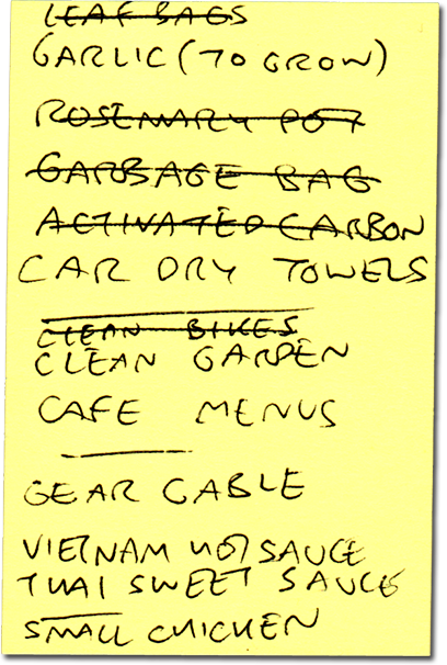 i wrote myself a veteran's day to-do list. originally i planned on mailing another norwegian-bound package to my friend frances, until i remembered the post offices were closed today. i made a quick jaunt to the dollar store to get some more kitchen trash bags and some scouring pads/sponges.