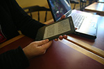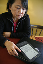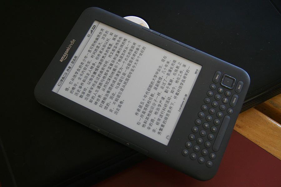 the kindle 3 is bigger than a paperback but smaller than a hardcover, and about the thickness of a magazine. the new black color in this 3rd generation model makes the kindle look even sleeker (although it is actually a bit smaller than the last model). it arrived already registered to my account. amazon doesn't sell any chinese novels (at least not yet), so the only way to get chinese books into the kindle is by sending it as a .doc attachment to the special kindle e-mail address, which then converts the document into a kindle file and wirelessly transfers it back to the device. the most amazing thing about the kindle is the screen, which is like nothing i've seen before. e-ink reminds me of an etch-a-sketch, but with 16-levels of grey. it's a display that completely mimics paper, in that the brighter it is the clearer it looks, and darkness makes it completely unreadable since there's no backlighting like traditional LCD/LED screens.