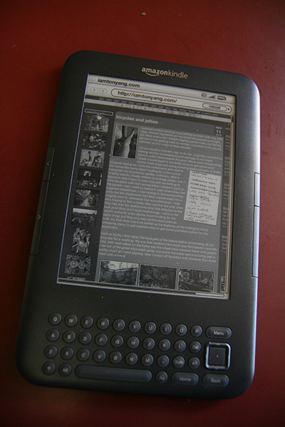 a "hidden" feature that i only learned about recently while researching was the fact that the kindle can actually surf the web since it can access the internet through wifi/3G. the rendering isn't all bad, based on the webkit engine, just that everything is in black & white greyscale. actual surfing can be a bit slow as the screen "redraws" and navigation - because the kindle doesn't have a mouse - works by dragging a slow cursor across the screen using the five-keys. but in a crunch and given a high level of patience, web surfing is totally possible. internet access is probably more useful for reading articles in online newspapers and blogs.