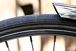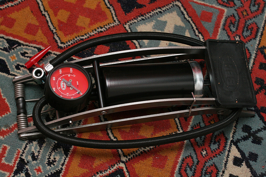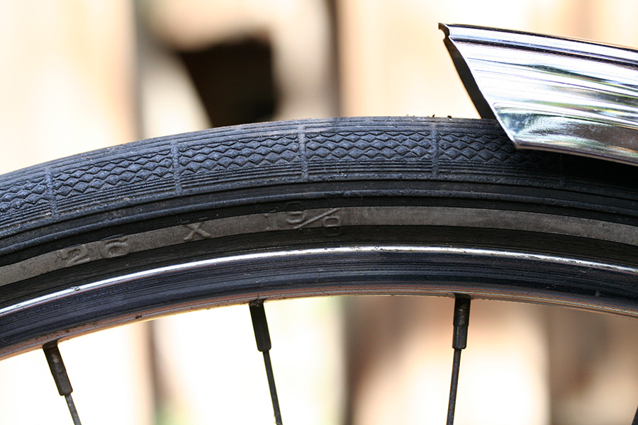 the bike uses 26" x 1 3/8" tires, which i think is the same thickness as my bianchi (but a bigger diameter). my foot pump arrived yesterday, and i used it to inflate the 2 tires to the specified 45 psi (i actually went up to 50 psi, figuring some air would escape when i released the hose).