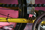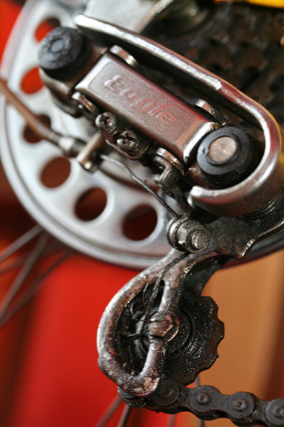 despite the rust, the previous owner kept the bike in pretty good shape, even repairing the frame with some touch-up paint. it's only a 7-speed (just a rear derailleur with a 7-gear sprocket, a single front cassette) but normally when i ride that's about all the gears i use.