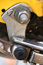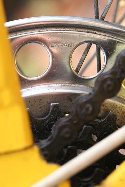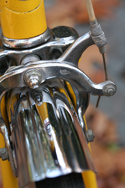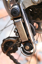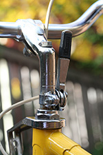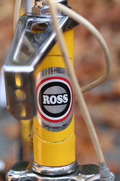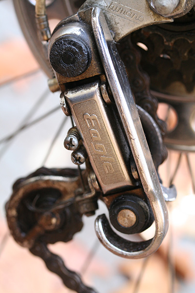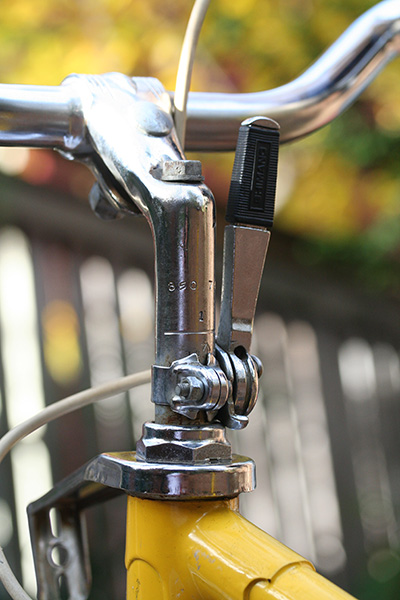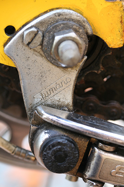 one of the unique things about this ross bike is the shifting happens from a lever located near the head tube, instead of the more familiar handlebar shifting. the bike itself is probably from the 70's or early 80's, so it's around 30+ years old (probably as old as i am), but even then shimano seems to be cornering the bicycle gear shifting market, as the shift level and derailleur on this bike are shimano brands.