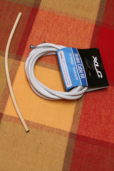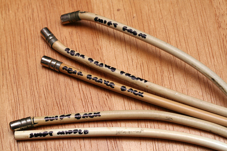 learning from my mistake, i made sure i took a bunch of photos of how the cables were routed, so i could do the same with the new cables. i ran into a problem though: there wasn't enough white cable housing for the 2 brake lines and the shifter. i solved it by deciding the shifter would get black housing instead (i had plenty of black cables) while the brakes would receive the whites.