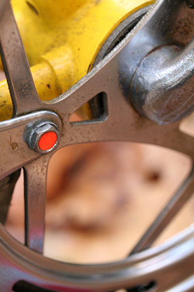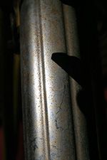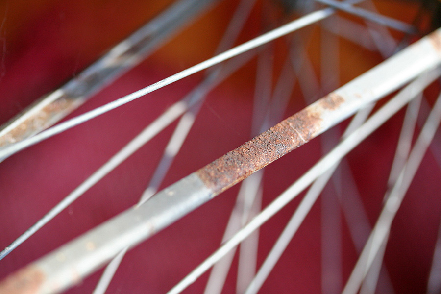 i sprayed some WD40 on the chrome fender and scrubbed it with a piece of steel wool. like magic, the rust came off, revealing the shiny silver metal underneath. i decided it was better to work outdoors, since little bits of steel wool were getting everywhere.