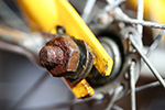 wheels that's equivalent to 50mm, a more perfect fit for the 60mm fenders. i ran into a bit of a snag though: one of the axle nut on the front wheel was completely rusted shut and i couldn't remove it. since the bike axle is attached to the fender and the fender attached to the frame, if i couldn't get the wheel off, i wouldn't be able to remove the fender. i spent the next 3 hours straining and groaning, armed with pliers and wrenches, but that rusted axle nut just wouldn't budge. by then it was already 1:00 and i still haven't had breakfast or lunch yet. i decided to stop after putting all the bolts back where they belonged, adjusting the balance of the wheel, even tweaking a few of the spokes.