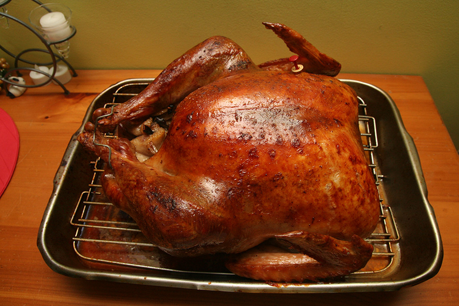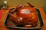 close to 5:00 my mother noticed that the oven was smoking. my sister said it was just a natural part of turkey cooking but when i opened up the oven, the juices at the bottom of the pan were smoldering. so much for cooking the bird at 350°! the turkey was ready. my mother removed it from the oven and i moved it to the dining room area.