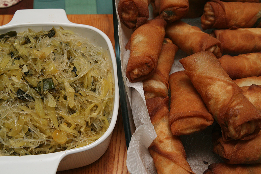 when my aunt lili and uncle matthew finally showed up close to 5:30, everyone pretty much started eating, even though my parents and myself were still busy in the kitchen. my mother was finishing the last of the fried spring rolls and my father was cooking the mussels. normally we do a bag at a time, but he wanted to save time and cook them all at once, which turned out to be a mistake since the mussels open up when cooked and could barely fit inside the large frying pan.