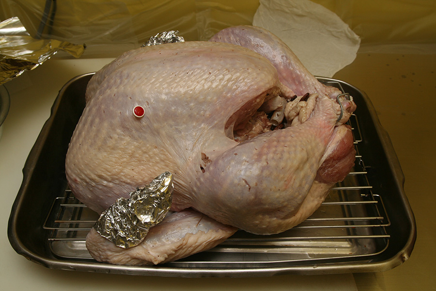 the 19 lbs. turkey finally went into the oven around 1:00. i read that the normal baking temperature is 325° but my mother and sister wanted to speed things up so my mother set the oven to 350°. in any case, the turkey should be ready by 5-6:00, just when the other guests will arrive (5:00).