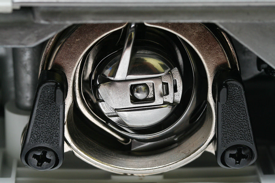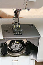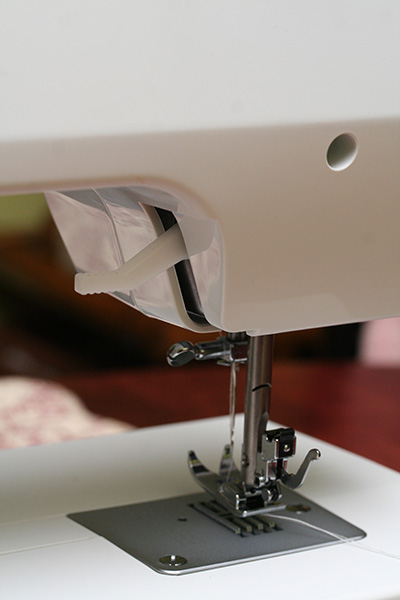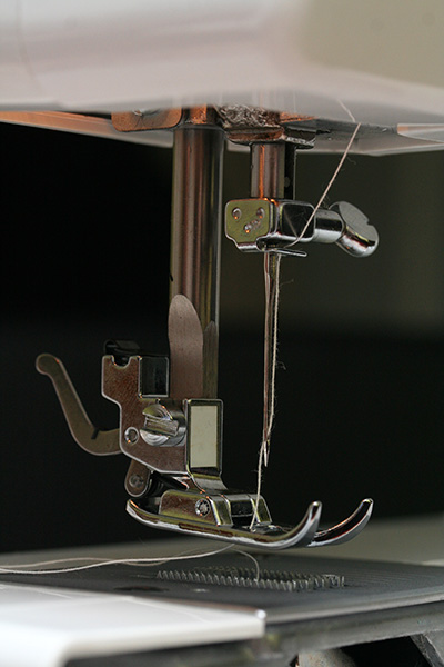 after threading the needle with the upper thread, you need to dip the needle into the needle plate platform using the big rotating knob on the side of the machine. when the needle comes back up, it should pull up the lower thread from the bobbin underneath. the 2 threads have to be long enough (about 6 inches) so they don't get pulled out during the sewing. luckily there's a handy built-in thread cutter on the side of the machine for just such an occasion. the final step is to lower the presser foot, which is this thing that looks like a short metal ski; it's job is to press down on the fabric and keep it in place.