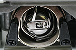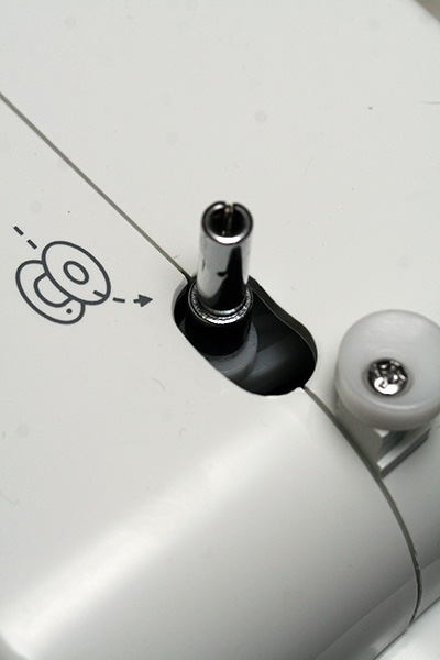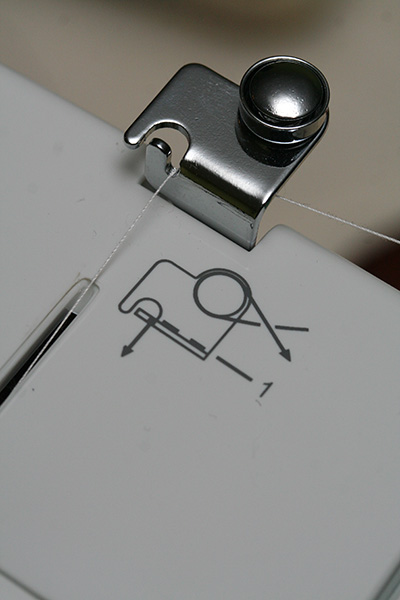 first my sister wound some thread onto a plastic bobbin. what for? i thought. it's cool and all, but why not just use the big spool of thread? turns out a sewing machine sews by using 2 lines of thread, one upper, one lower. i did not know that. the big spool is for the top thread, the bobbin is the lower one. the bobbin lives in a complicated-looking metal thing called a bobbin cage (AKA case) that lives underneath the sewing platform. now the upper thread can't just be directly spooled into the sewing needle; it has to pass through a series of guides before making its way to the needle. a sewing needle is different from a regular needle in that the eye is actually located close to the tip (as opposed to the end).