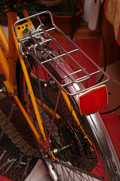 i wasn't planning on it and was already preparing for bed when my obsession got the best of me and i decided to put the other rack on the ross bike. nothing like working on the bicycle in my underwear at 2:00 in the morning! first i had to put back the fender, followed by the rear wheel. the wheel was a challenge, to get it to seat correctly in the fender,