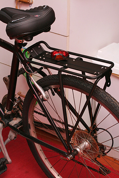 and also catch onto the chain, which were still dirty and left my hands like i was playing around in black ink. once that was down, i turned the bike rightside-up and went about attaching the rack. the wald rack ($18.98) came in chrome and arrived fully assembled (like welded together into a single piece). i knew from prior research that it'd fit the ross bike. the rack itself has a nontraditional mount, and wouldn't have fit any of my other bicycles. it only has 3 points of contact on the frame: 2 points near the rear axle and 1 point in a central spot behind the bike seat. the central post is also shared by the caliper brakes, which required some additional adjusting once i screwed on the rack mount brace. unlike the megarack, this single connector is hard enough that it can't be bent by hand. usually the rack as leverage, i pressed down on the connector anyway, until it came close to being horizontal with the socket on the rack.