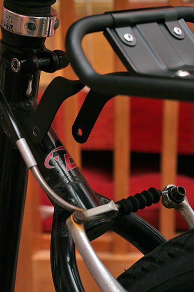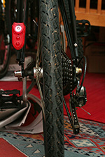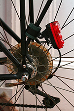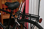 i was ready to give up until i saw a diagram showing that the light mount (actually the drawing was for my rear helmet light, but the principle's still the same) can also be attached to one of the rear braces, just angled upwards a little bit. i found the perfect place but it wasn't on the bike frame; instead, it was on one of the downward support braces of the rear rack. because the mount was designed for a seat post, the diameter is biggest than the brace; as a solution, i cut a strip of rubber mousepad material and coiled it around until it got big enough for the mount to be attached. the final result looks pretty sturdy, but i won't know for sure until i take the bike on a night time test ride.
