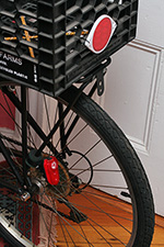earlier during the day i went down into the basement and dug up a milk crate. it's not as big as the one i have on my bianchi bike, but it'll do until i can find a suitable replacement. i've been thinking about getting a pair of rear collapsible bike baskets, i'll look around the neighborhood for examples. unfortunately there's nothing on the crate i can use to attach my rear bike light mount. i tried getting creative with some garbage bag ties, but was unsuccessful.