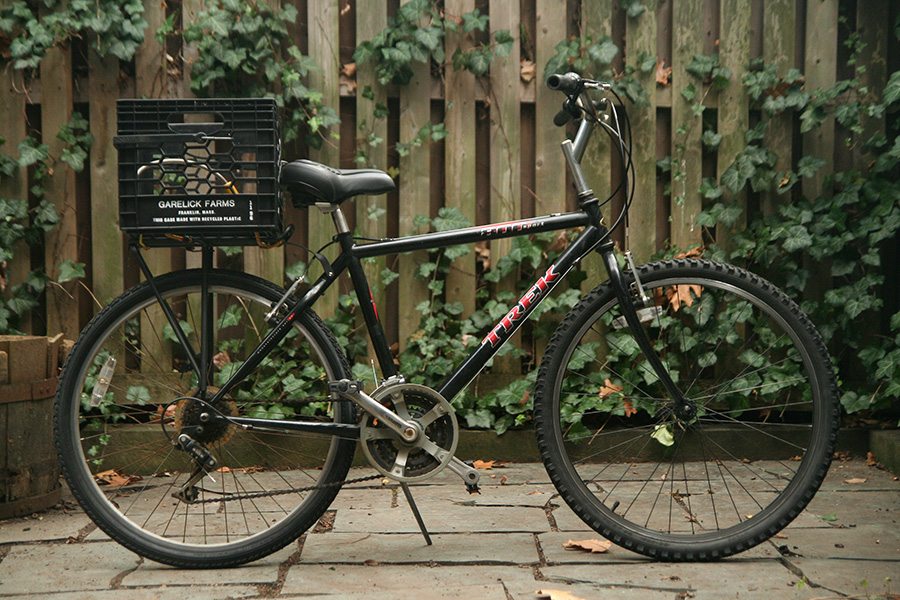 i got a chance to finally take the newly renovated trek 800 for a ride today when my parents called asking me to pick them up from alewife station. even though the seat is still a little tall (replaced the old seat post with the new one), it actually rides quite smooth, and i may decide to keep the seat post as length, no cutting. the milk crate abuts the seat, but i don't notice it when i ride. if i lean back far enough i do touch it, but it's more of a backrest than an annoyance. i'm trying to decide whether i need fenders and collapsible rack baskets, which will another at least another $60 to a bike i'm trying to rebuild on the cheap. the front wheel is still the old 2" wide mountain bike tire, while the rear wheel is a new 1x5/8" road tire. i read that having mismatched tires is actually a special strategy for winter riding, so i'll be testing that out.
