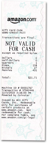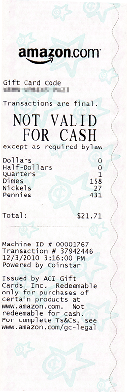 whatever system it uses it's apparently very smart. it even rejected a badly scarred US penny. once it was all over i hit the "done" button. now i always thought coinstar machines were a ripoff because if you want your coins converted into cash, coinstar charges a 10% fee. the loophole is if you convert your money into a gift certificate from a list of partnership companies, the fee would be waived. just so happens amazon is one of these partners, and since i use amazon for most of my online purchases, i was more than happy to have my change transferred to amazon. i hit the "confirmation" button one more time and i could swear i heard the sound of a modem dialing out. after a few moments of waiting, the machine spit out a non-assuming paper receipt with the amount of coins exchanged and the special amazon gift certificate code.