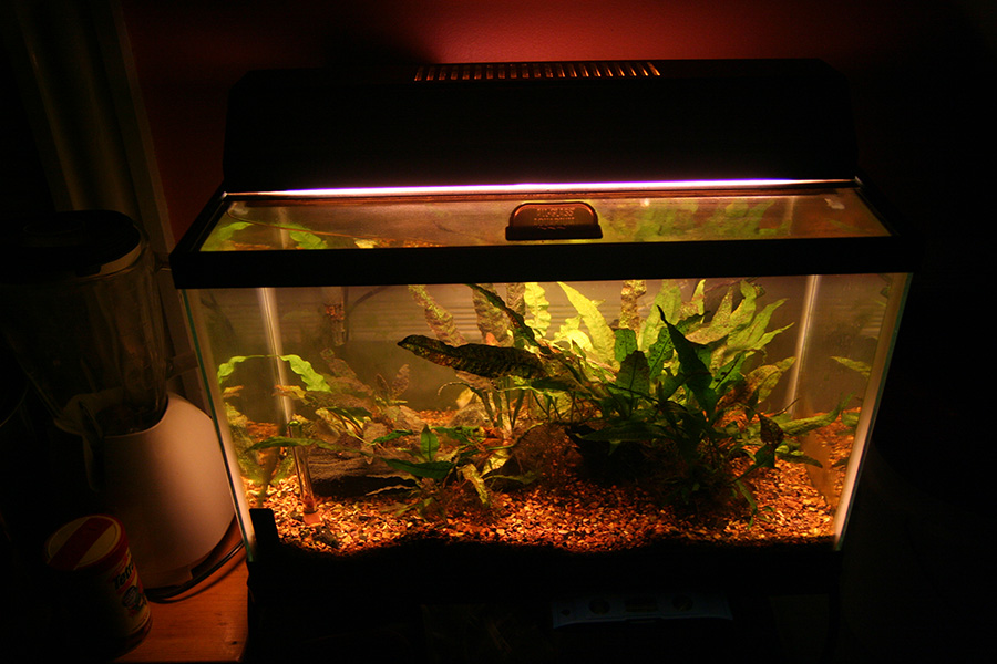 i put in the new fluorescent bulb. for something that's supposedly a plant light, it's awfully yellow. when it comes to store bought aquarium lights, i'm not sure if i've ever gone with philips before. i think in the past i used GE, and those were better lights. the starter on this particular aquarium light probably needs to be replaced at some point (they're pretty cheap, about $2). it still works, but it takes a long time before the light will turn on.