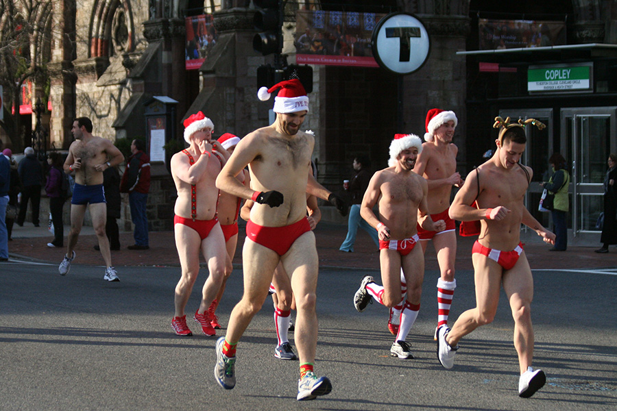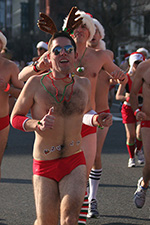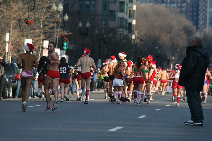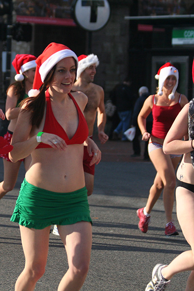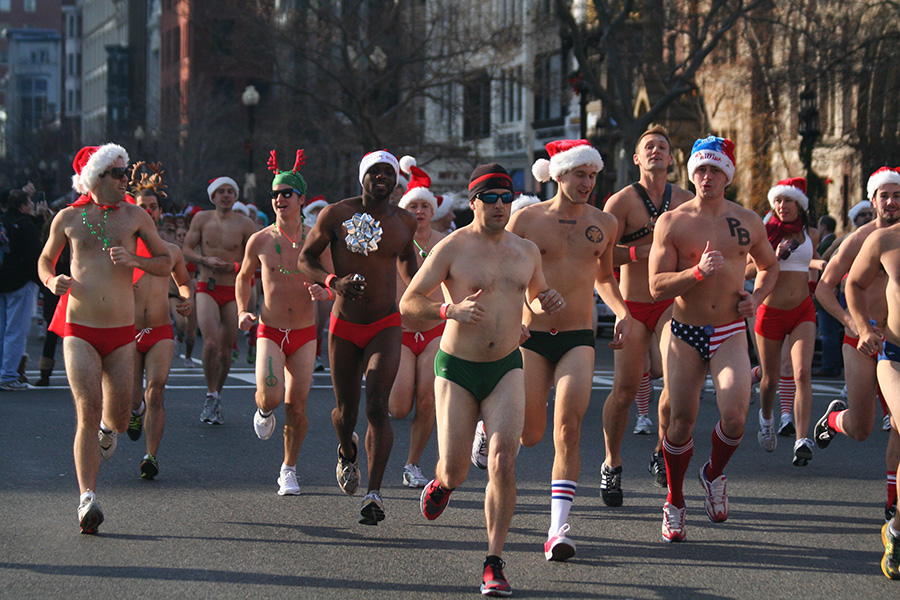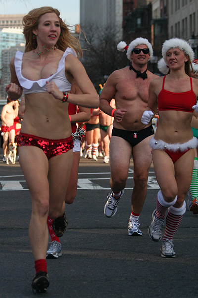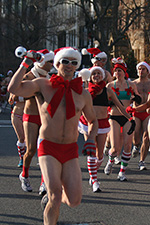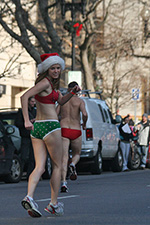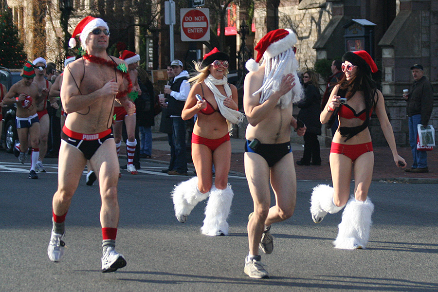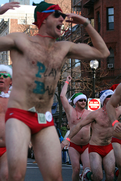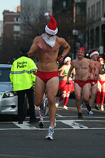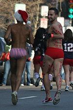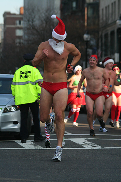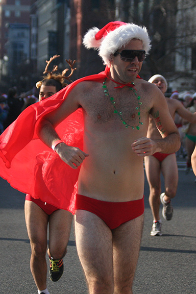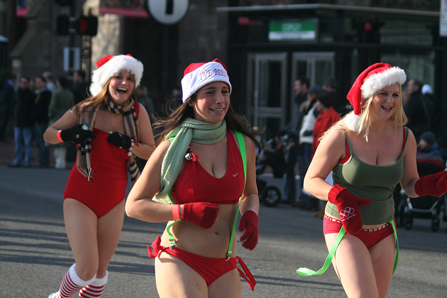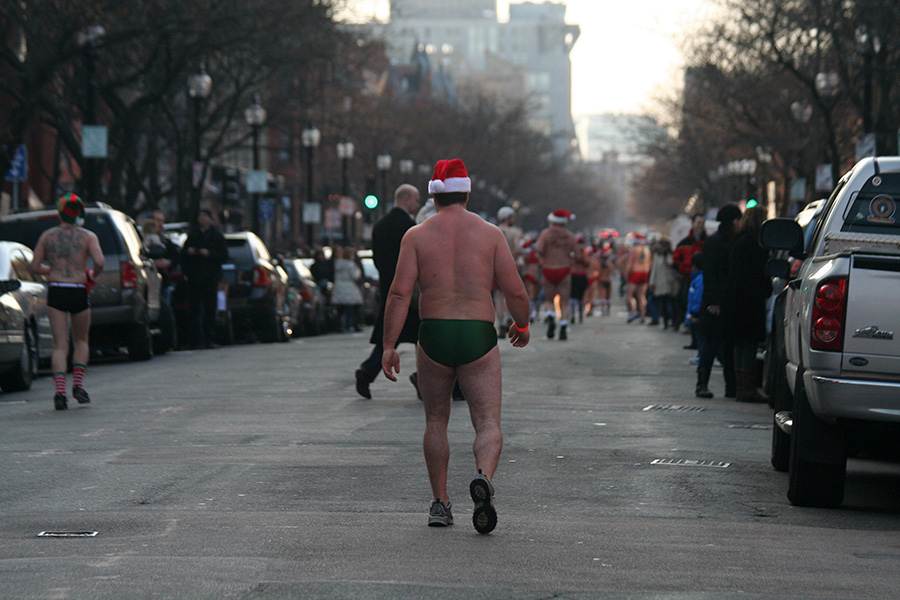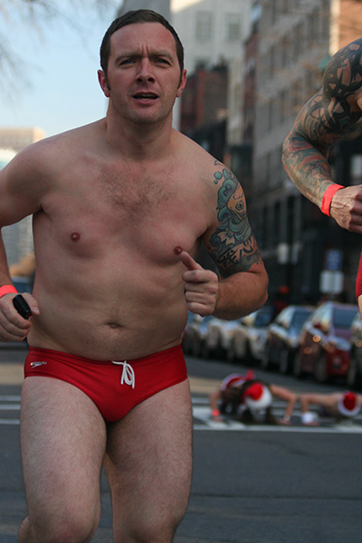 the whole santa speedo run lasts roughly 10 minutes, which is the amount of time a normal person takes to run the 1 mile course. what gets lost in all the excitement of seeing people running around in their festive holiday underwear is the fact that it's actually pretty cold for these guys and girls. speed is of the essence, and the faster you can run a mile, the faster you can get warmed up indoors. i feel bad for the few out-of-shape runners that end up having to walk in the cold a portion of the course. also lost is that the santa speedo run is actually for charity, and each runner is supposed to raise a certain amount of money. it's not just running in your underwear for the sake of exhibitionism!