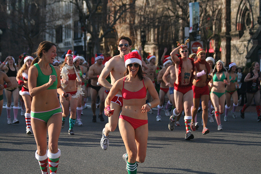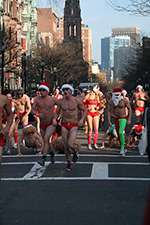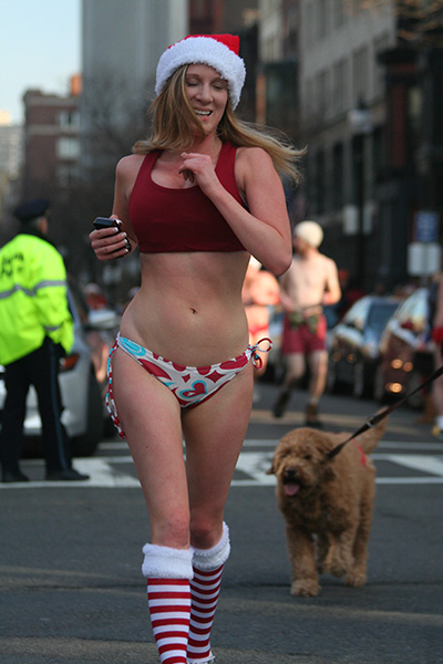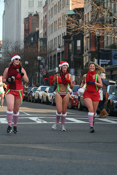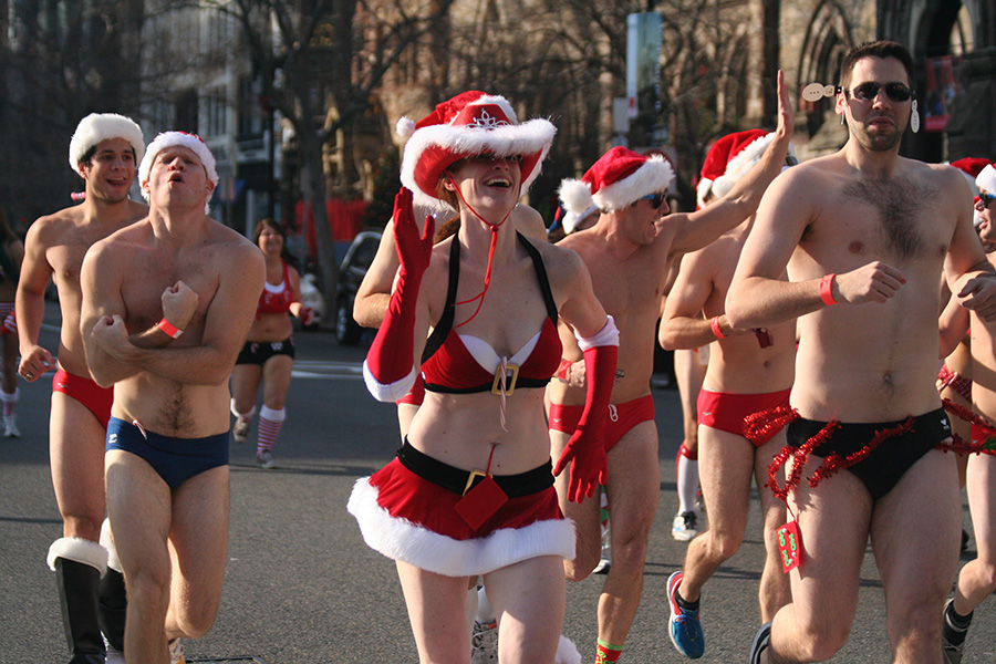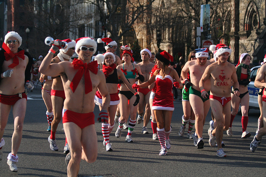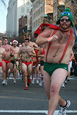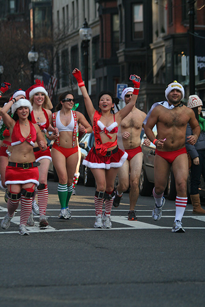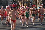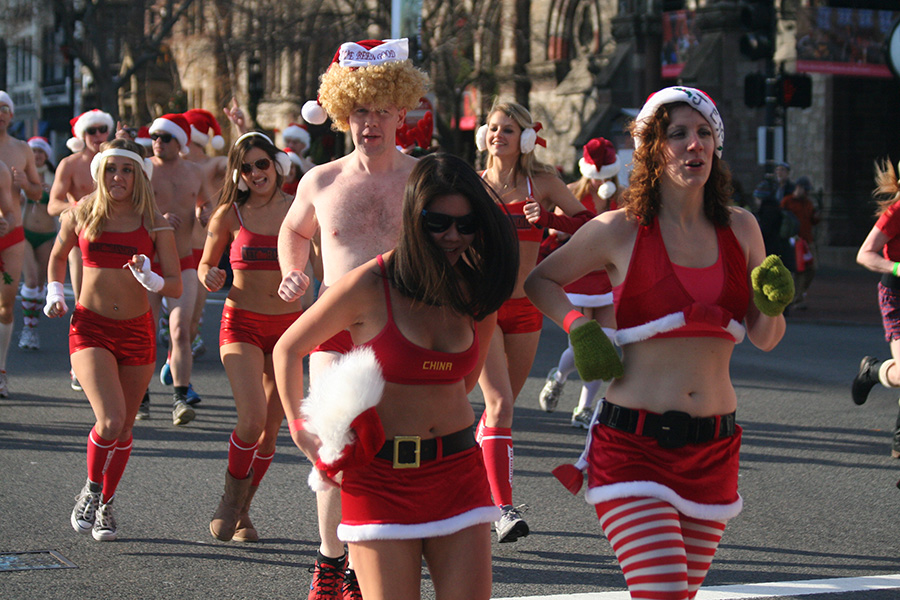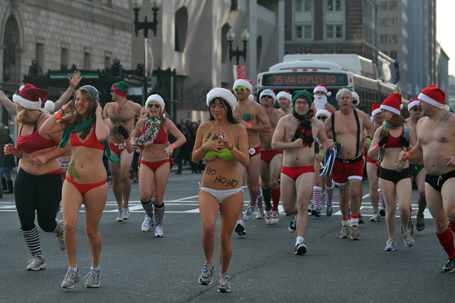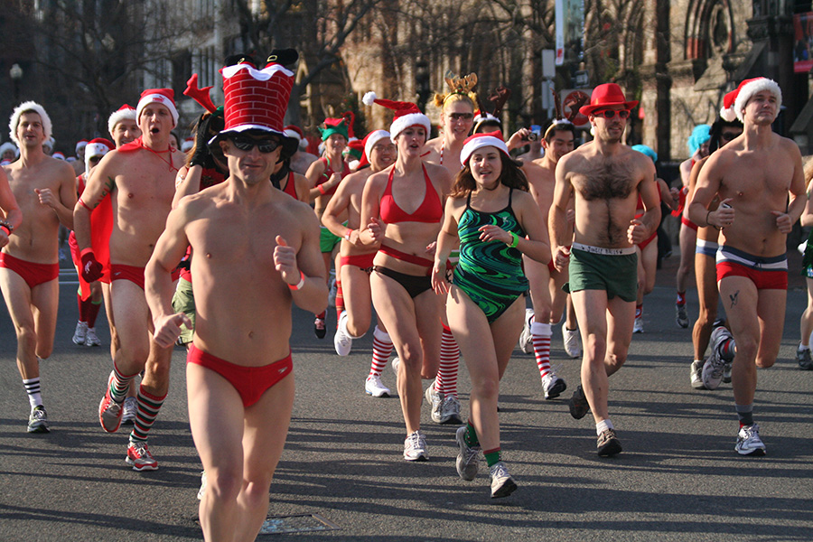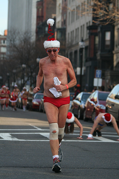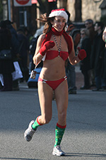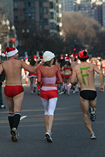the whole santa speedo run lasts roughly 10 minutes, which is the amount of time a normal person takes to run the 1 mile course. what gets lost in all the excitement of seeing people running around in their festive holiday underwear is the fact that it's actually pretty cold for these guys and girls. speed is of the essence, and the faster you can run a mile, the faster you can get warmed up indoors. i feel bad for the few out-of-shape runners that end up having to walk in the cold a portion of the course. also lost is that the santa speedo run is actually for charity, and each runner is supposed to raise a certain amount of money. it's not just running in your underwear for the sake of exhibitionism!