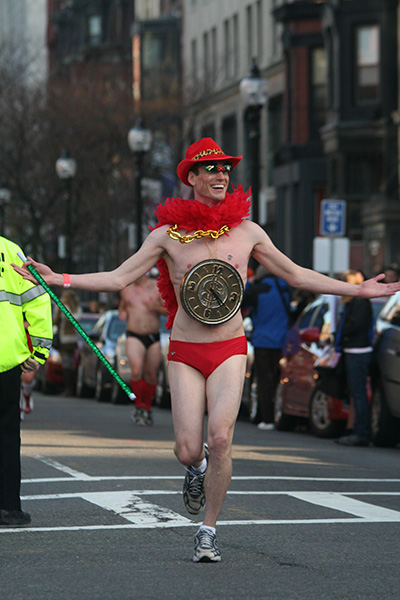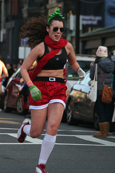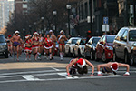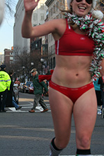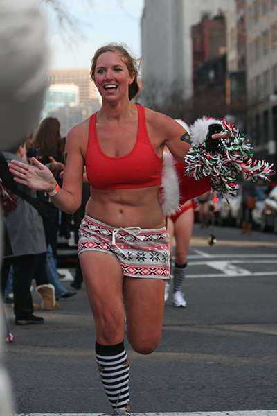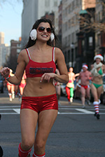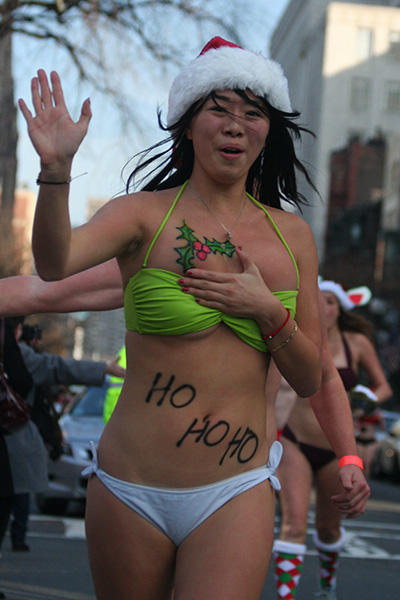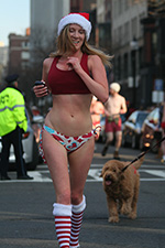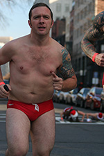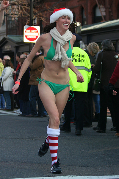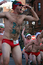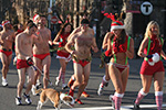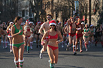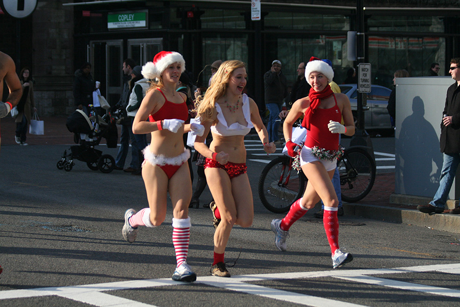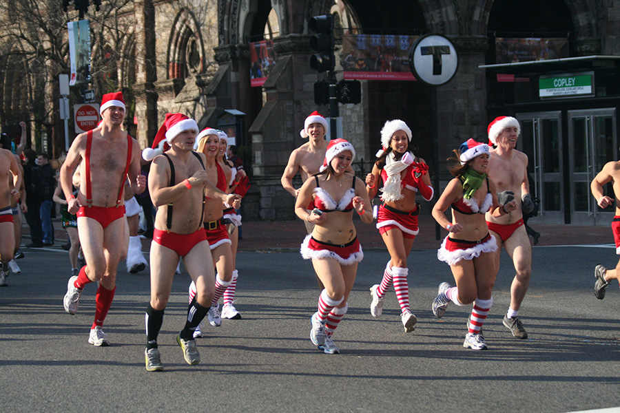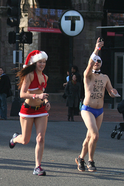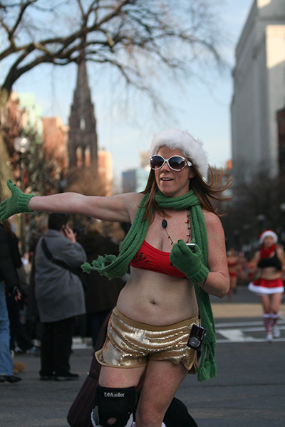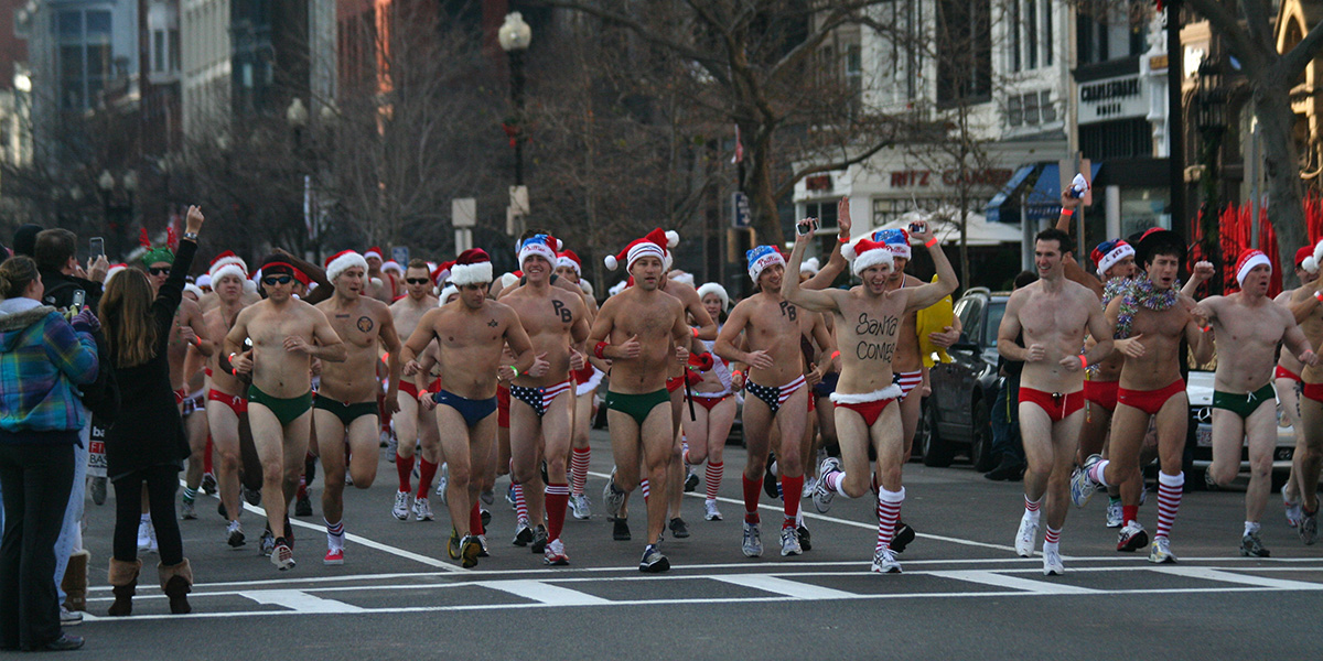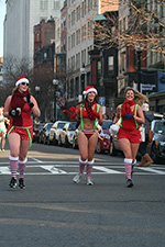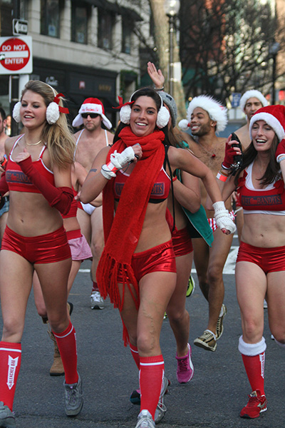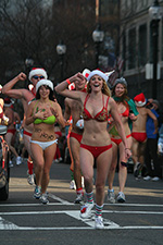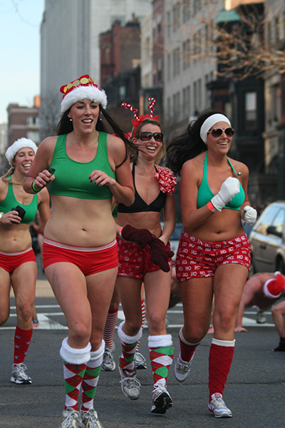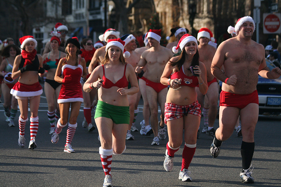 the whole santa speedo run lasts roughly 10 minutes, which is the amount of time a normal person takes to run the 1 mile course. what gets lost in all the excitement of seeing people running around in their festive holiday underwear is the fact that it's actually pretty cold for these guys and girls. speed is of the essence, and the faster you can run a mile, the faster you can get warmed up indoors. i feel bad for the few out-of-shape runners that end up having to walk in the cold a portion of the course. also lost is that the santa speedo run is actually for charity, and each runner is supposed to raise a certain amount of money. it's not just running in your underwear for the sake of exhibitionism!