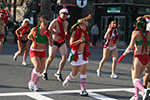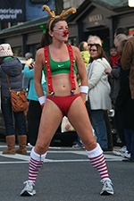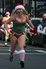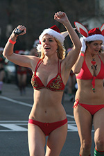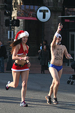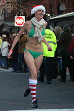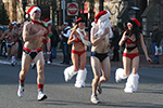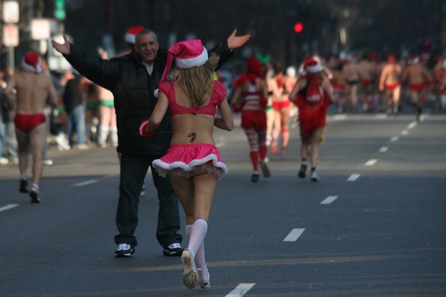 the santa speedo run always starts on time, 1:00. when you're in your underwear on a cold december day, any kind of delay is not something you want. it's not a big event (although every year more people seem to be running it) so the police don't block off the intersections until the very last minute. i was standing next to a small group of florida tourists who just heard about the event and wanted to check it out, each one armed with a tiny point-and-shoot camera.