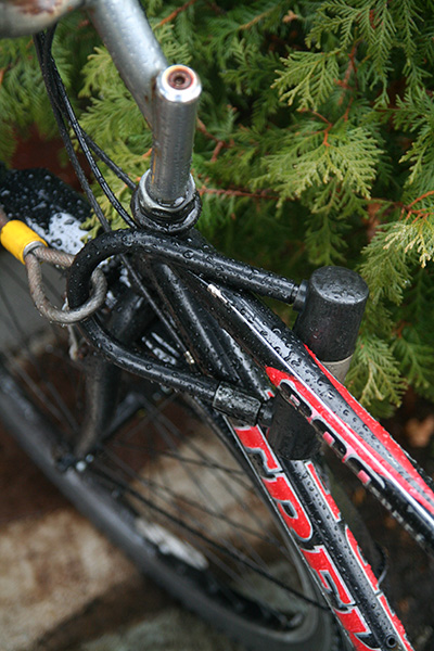 but i was wearing my rubber boots, so i couldn't tell if that would've gotten my normal shoes wet. still, having fenders in the rain is better than not having them. i stopped by the cafe briefly to drop off the new kindle 3 case and the reading light for my father. it wasn't brief enough, because as soon as i left, it began to rain steadily again. my jeans got progressively darker as my clothes slowly got soaked from the rain.