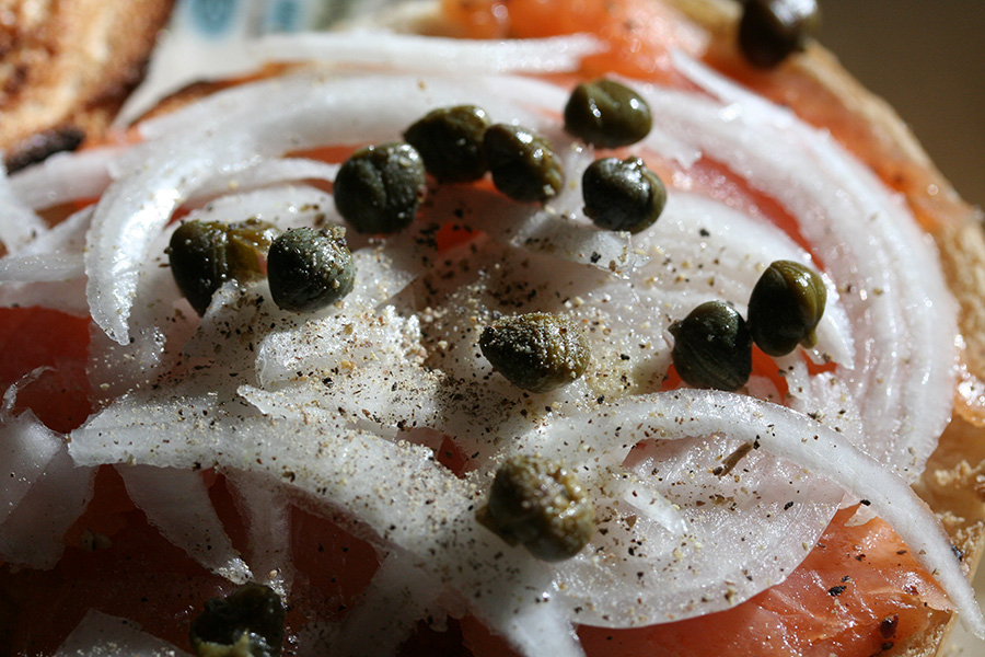 i heard today was the coldest day of the week; i hardly noticed since i didn't go outside except to quickly bring in the trash cans. for lunch i had some smoked salmon on a toasted onion bagel with more sliced onions and capers.
